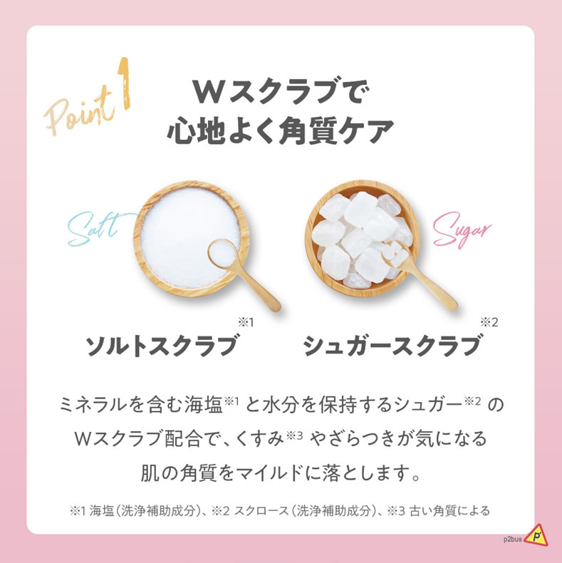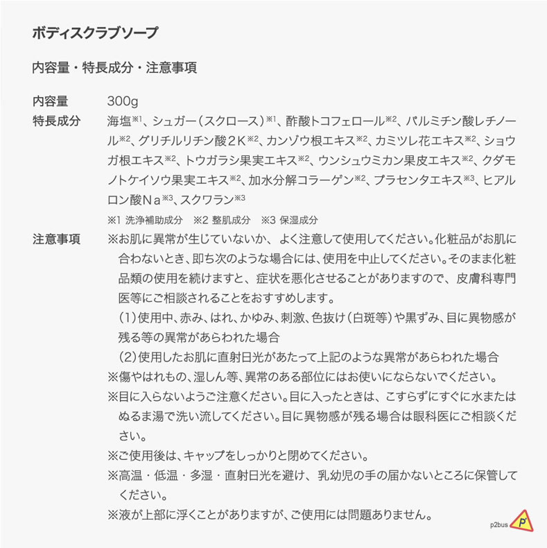 Ingredients: Sea salt, sugar (sucrose), tocopherol acetate, retinol palmitate, glycyrrhizic acid 2K, licorice root extract, chamomile flower extract, ginger root extract, capsicum fruit extract, mandarin orange peel extract, kudamono passiflora fruit extract, hydrolyzed collagen, placenta extract, sodium hyaluronate, squalane
