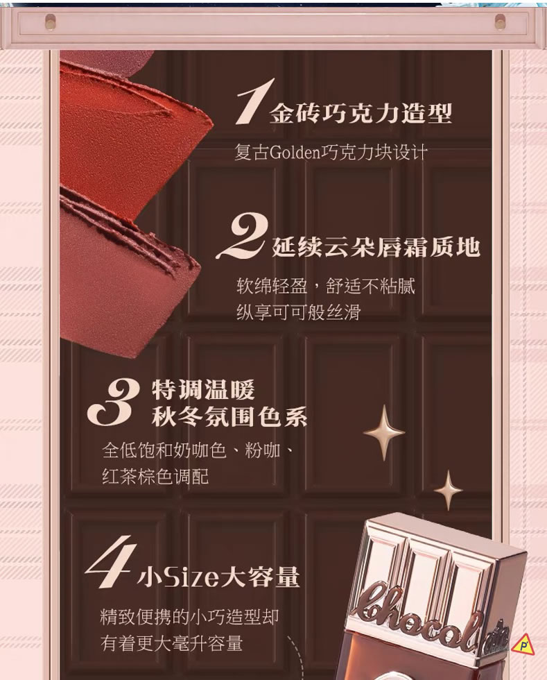 The chocolate-inspired makeup shaped like a chocolate box, this lip cream is available in 9 different shades. The pigmented color is buildable, swipe on once for sheerer coverage, and two to three times for a bolder look.